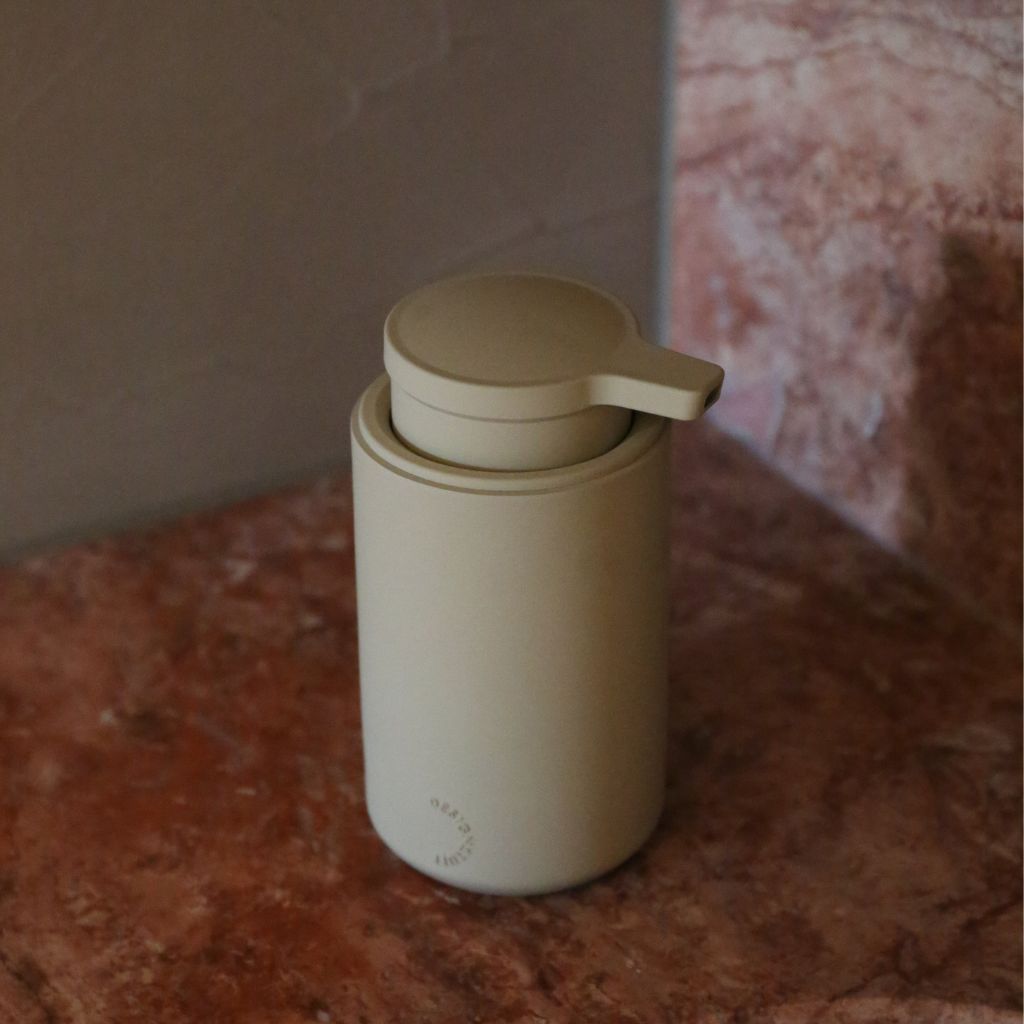 A matte black ARC soap dispenser sits on a beige travertine countertop beside a modern, curved brass faucet.