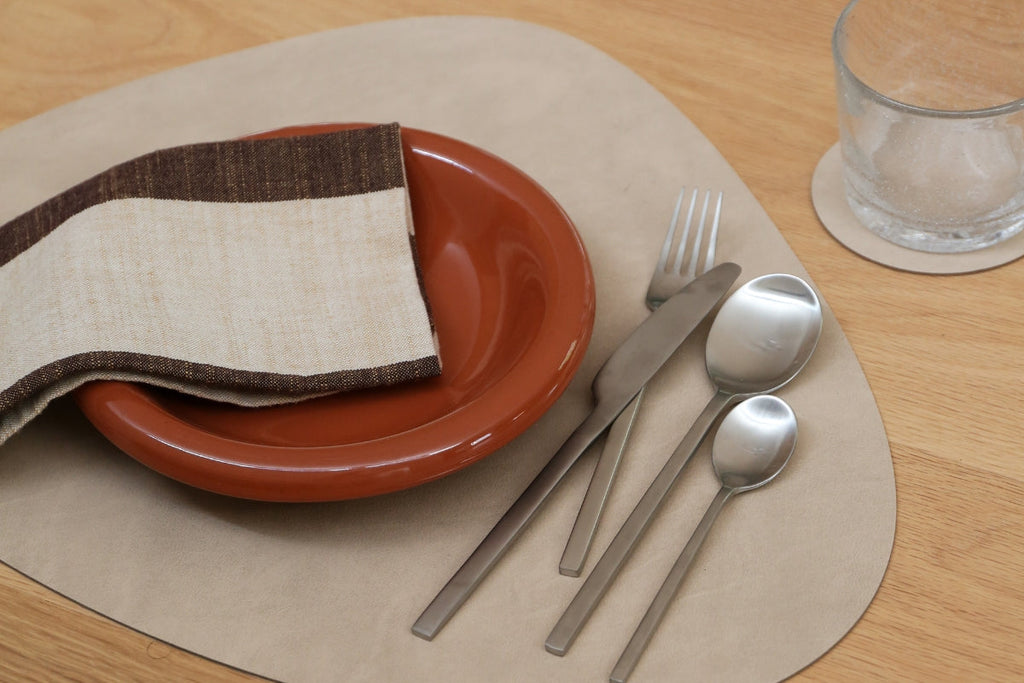 Not your average rectangle. This large-scale placemat glides around your setting with a smooth, sculptural bend — part design statement, part table protection.