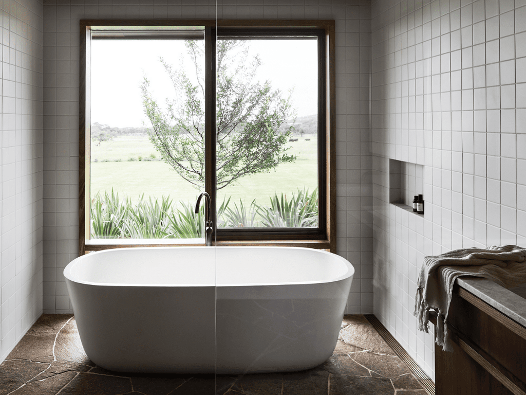 Chelsea Hing has approached the space with a strategy to allow the tub to become the central hero piece of the space. Contrasting the white tub against a black backdrop proves highly effective. And by using a woven-esque tile on a concave wall, the space has depth and steers clear of a flat 2D finish. The touch of brass through the standing tapware and wall sconce is the glamorous cherry on top.