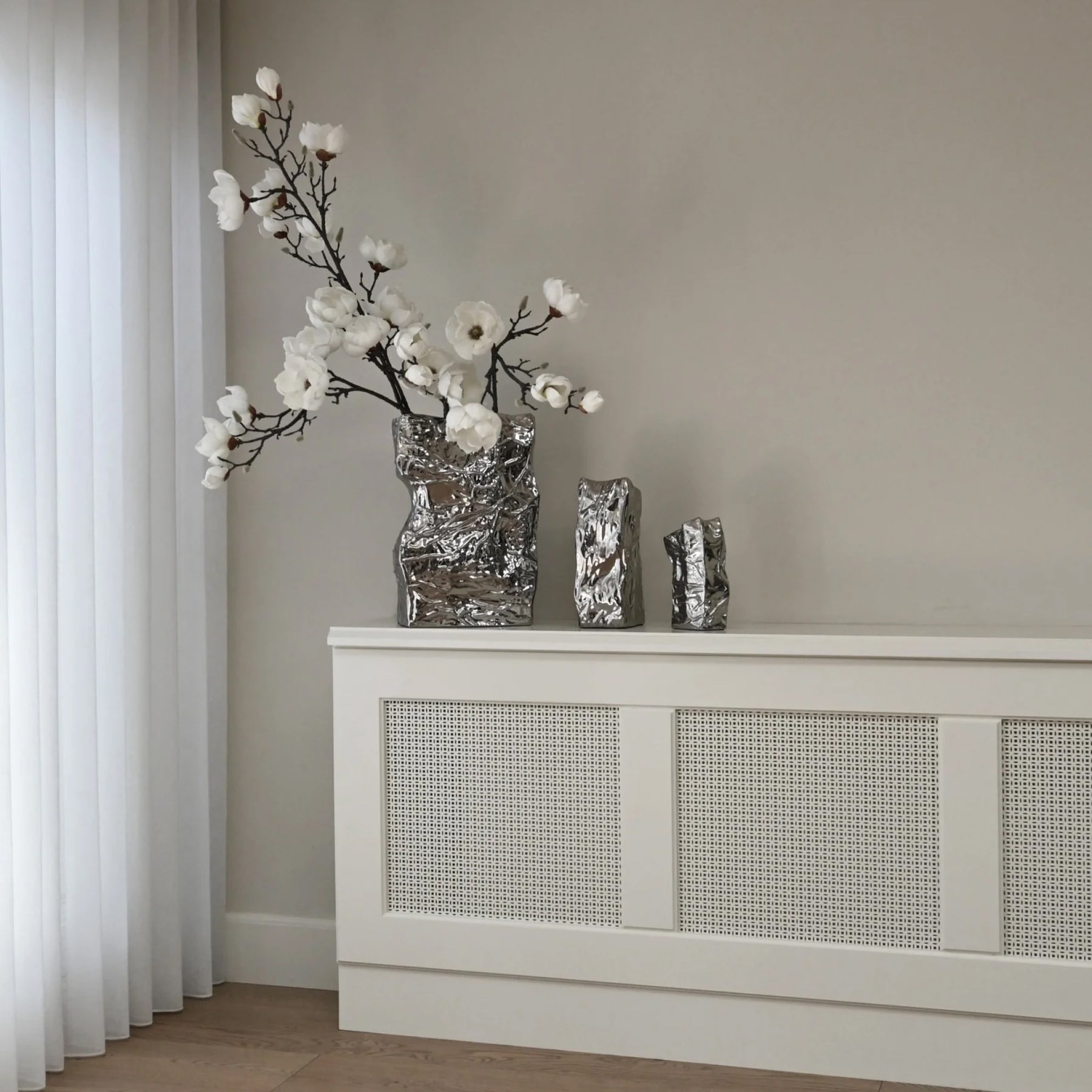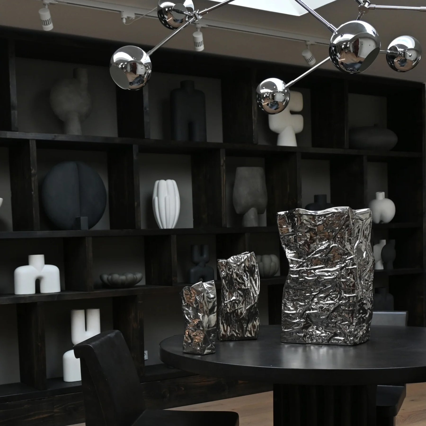 The sleek Chrome finish features a mirror-like shine with a modern twist. Waterproof and glazed on the inside, the Kami Vase is ideal for fresh flowers and adds a touch of natural elegance to any space.