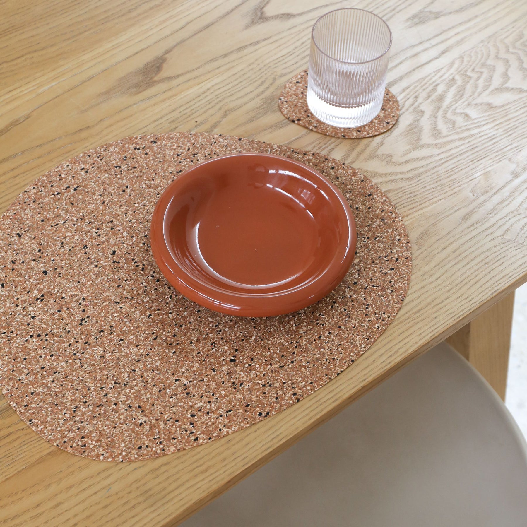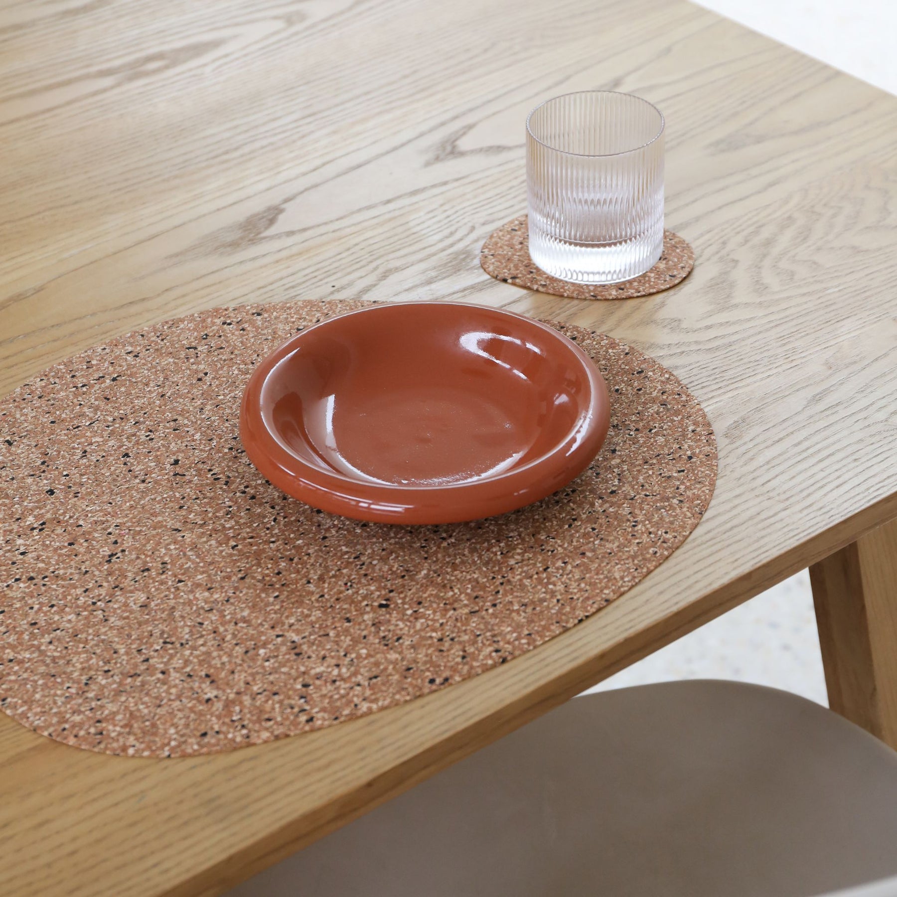 Made from rubber with a speckled 'Freckle' finish, the material provides a non-slip grip and protects surfaces from scratches and spills. The organic silhouette creates a flexible setting that works on both round and rectangular tables.