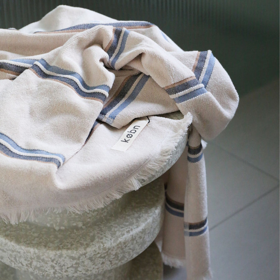 Every detail of Købn is thoughtfully considered. The towels are reversible, with one side terry and one side plain weave, a finish more akin with interior fabrics. They feature raw edge fringing and drop pile stripes. The towels are crafted by a family-owned mill in Denizli, Turkey, a region synonymous with high quality textiles, ensuring impeccable fabrication and ethical production.