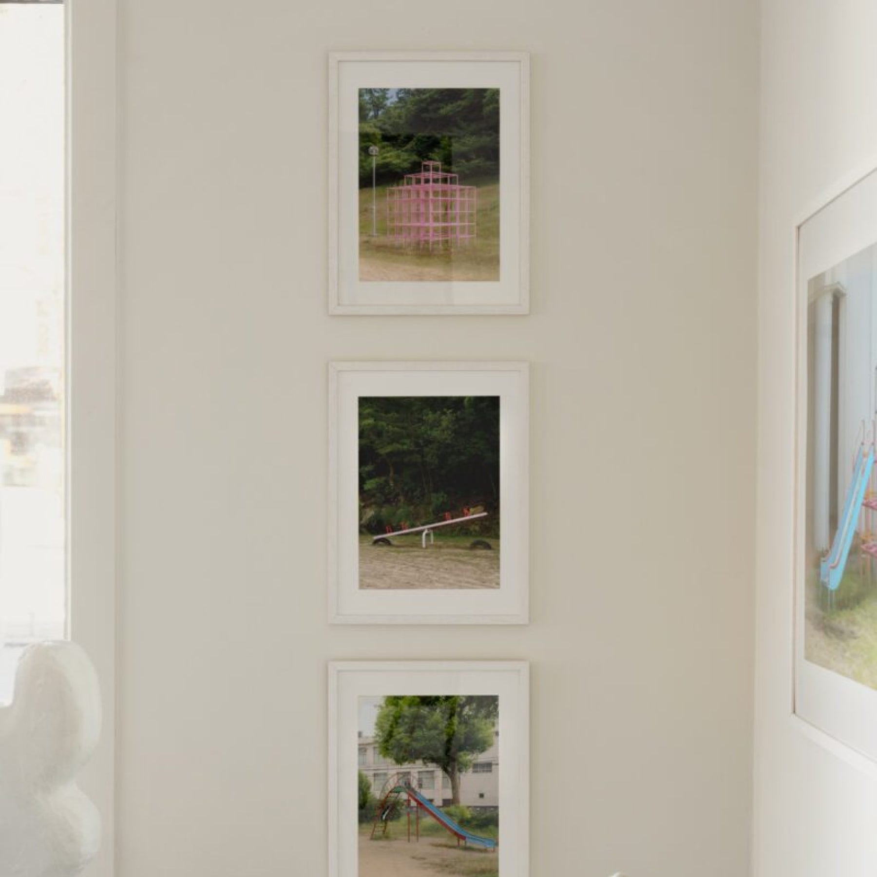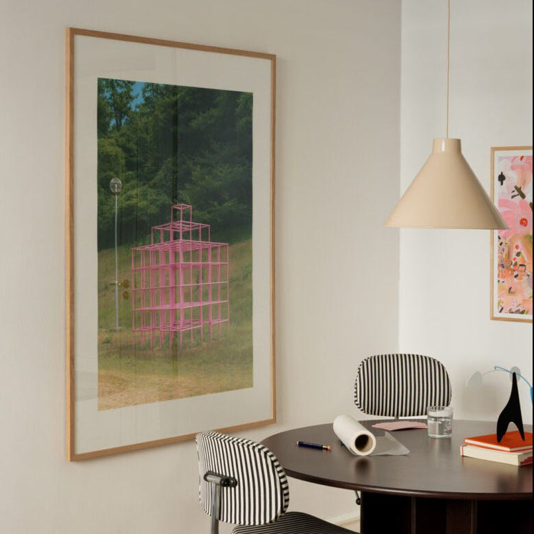 Jennilee Marigomen’s exclusive fine art print for The Poster Club captures the quiet geometry of play. A pink metal grid rises from a grassy field, its cube-like layers echoing architectural rhythm and childhood wonder. Framed by trees and soft daylight, the composition balances structure with serenity. It’s a study in contrast for interiors that lean into sculptural calm, subtle colour, and the unexpected poetry of everyday spaces